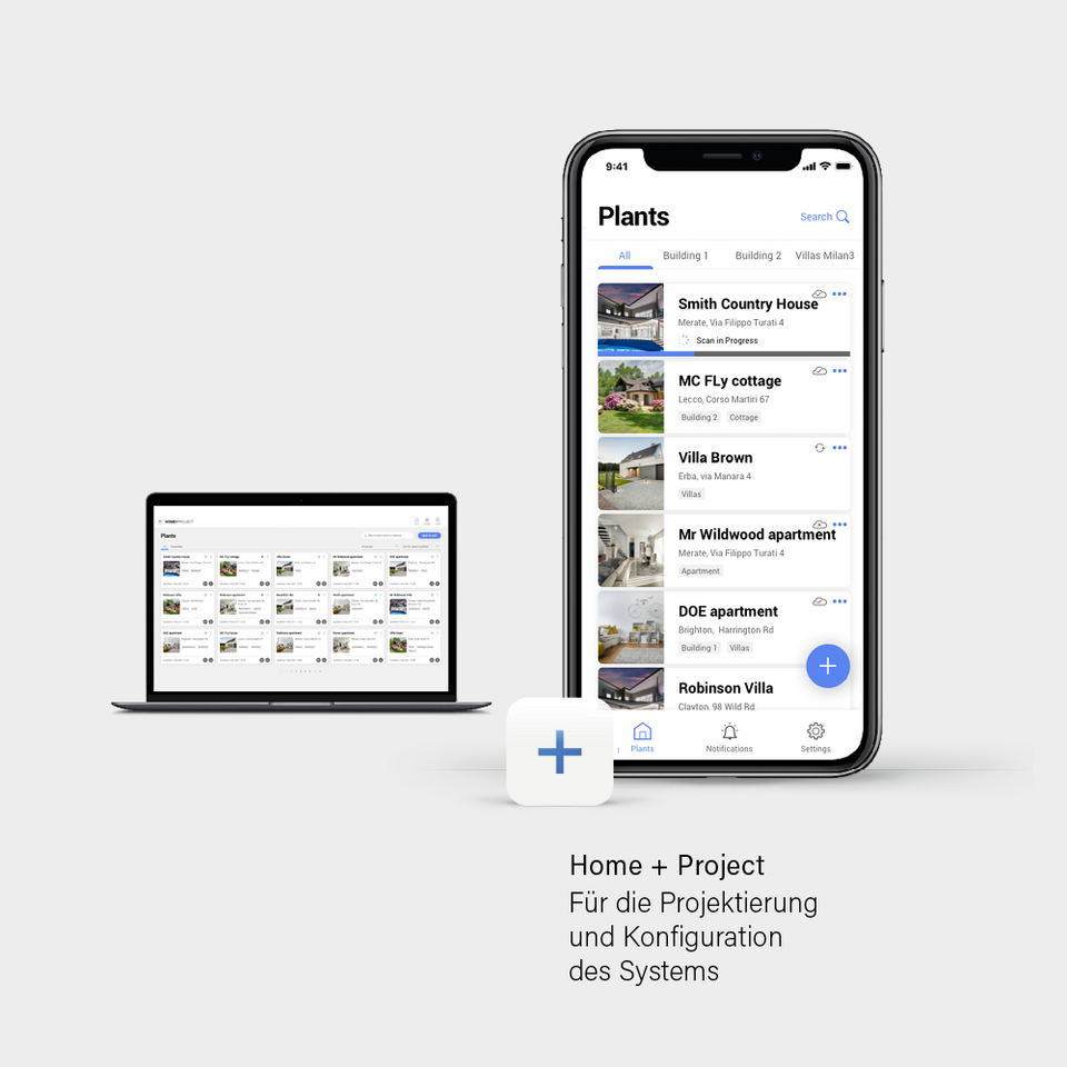 Mit der Home + Project App können Sie alle elektrischen Geräte in Ihrem Zuhause miteinander verknüpfen und Ihr Hausautomationssystem bequem in Betrieb nehmen – und das ganz ohne PC-Software! Die App führt Sie Schritt für Schritt durch die Konfiguration, sodass alles einfach und selbsterklärend wird. Sobald Sie ein Projekt erstellen, erhalten Sie sofort Zugriff auf die Gesamtansicht Ihrer Anlage: Räume, installierte Geräte, Servereinstellungen, erstellte Szenarien und mehr. Sie können den Status überprüfen, Änderungen vornehmen (Räume und/oder Geräte hinzufügen oder entfernen usw.) und Notizen sowie Dokumente hinterlegen. Die Nutzung der Home + Project App erfordert lediglich, dass Ihr Smartphone/Tablet mit demselben lokalen WLAN verbunden ist wie Ihr Server. Den MyHOME-Server können Sie entweder in Ihrem Verteilereinbaukasten platzieren oder die Server-Funktion mit der Classe 300EOS with Netatmo erhalten. Nach Abschluss der Inbetriebnahme steht Ihnen automatisch die Home + Control App zur Verfügung. Damit können Sie Ihre Produkte bequem von zu Hause oder unterwegs aus verwalten, maßgeschneiderte Szenarien erstellen und einrichten.​